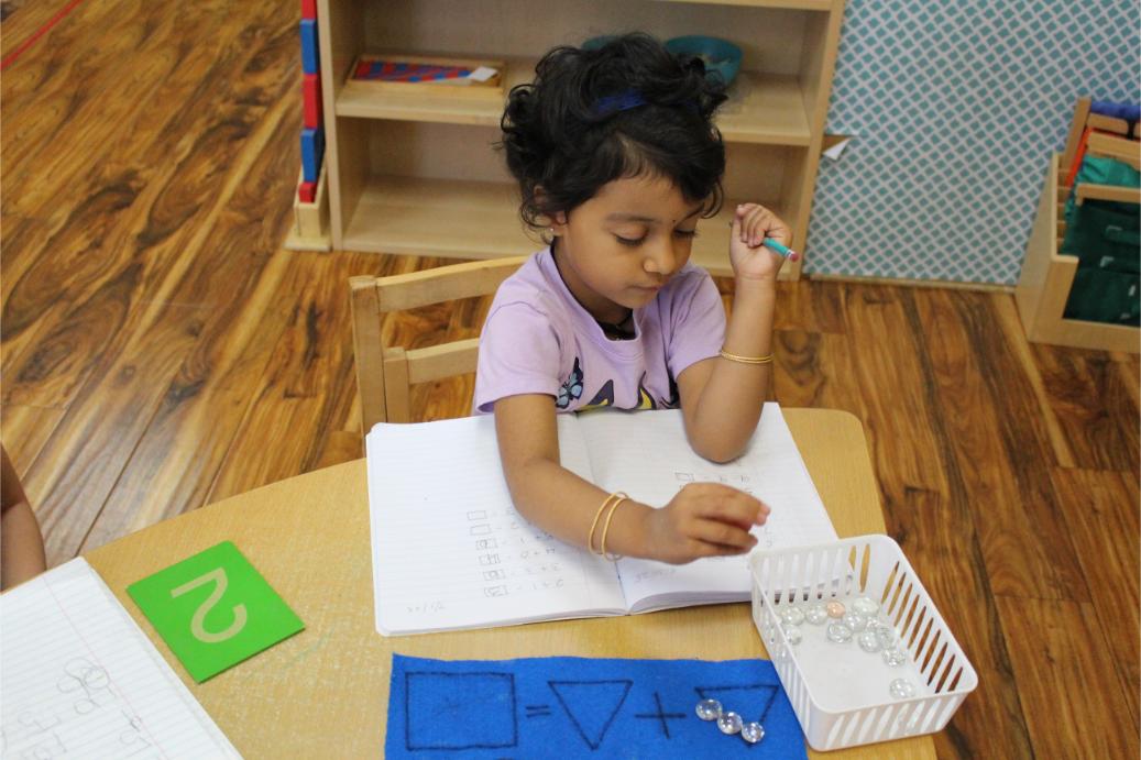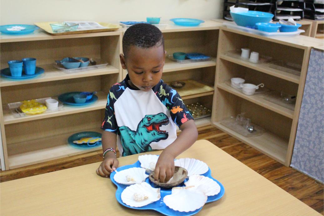 In a prepared environment the children work in five different Montessori areas including practical life, sensorial, language, math and cultural.